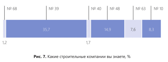 На рис. 7 показаны некоторые результаты замера известности строительных компаний. На вопрос «Какие строительные компании вы знаете?» были названы 72 компании, которые, по мнению респондентов, являются застройщиками многоэтажных жилых зданий.