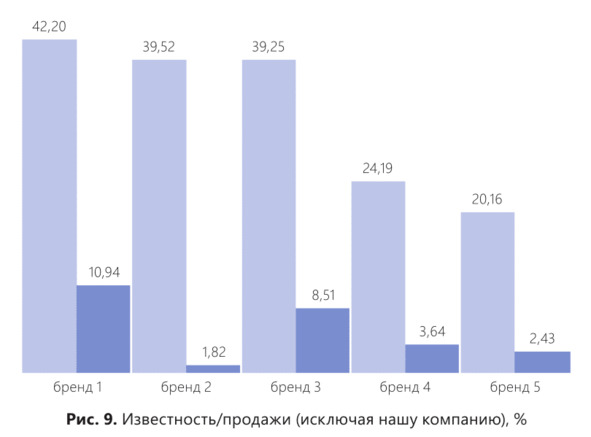 Картина становится более интересной, когда мы начинаем сравнивать доли рынка компаний на уровне известности и продаж. Обратите внимание на рис. 8.