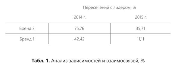 Далее было выявлено (табл. 1), что в 2014 году 75,76% клиентов компании Z совершали последующие покупки у конкурента «Бренд 3» и 42,42% клиентов – у конкурента «Бренд 1».