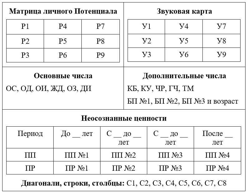 Матрица личного Потенциала Р1–Р9 – набор личностных качеств, описывающих взаимодействие человека прежде всего с собой, его таланты, базовые основы личности и характер. Также эти качества проявляются в общении и влияют на самооценку, постановку целей, движение к целям, понимание себя, творческий потенциал. Глава № 9.