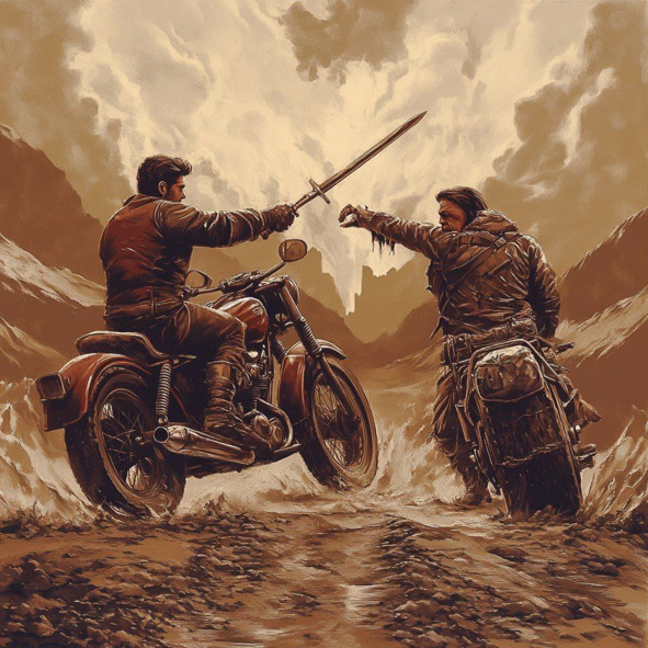 Роберт моментально переключился в боевой режим. Он одной рукой управлял мотоциклом, а другой держал меч, готовясь защитить своих товарищей. Пыль, поднимающаяся от их колес, смешивалась с звуками металла и гудением двигателей. Дикари нападали хитро и умело: резкие повороты, внезапные прыжки с мотоциклов и стремительные атаки ножами и металлическими прутьями. Каждое движение требовало мгновенной реакции.
