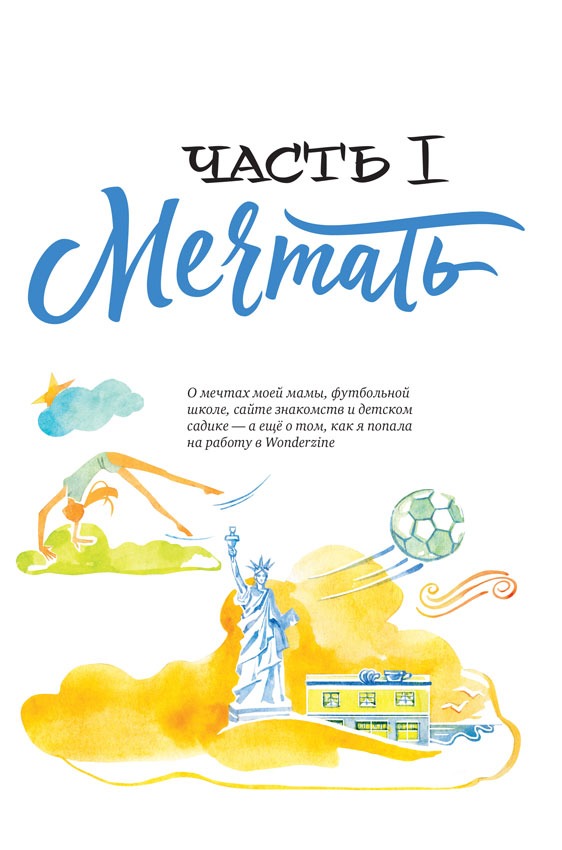 В книге четыре части, посвящённые собственно мечтам, учёбе, работе и личным отношениям – но это очень условное, приблизительное деление, позволяющее чуть систематизировать текст. Я хочу рассказать о своей жизни, о том, как ничего не бояться и начинать с нуля. О том, как я научилась дорожить дружбой. О том, каково это, когда приходит письмо с требованием покинуть страну в течение 15 дней и единственный выход – не паниковать, а срочно выучить ещё один язык и поменять паспорт. О том, как я находила работу в стране, известной на весь мир высоким уровнем безработицы. О том, как менялись мои представления о красоте. О том, что все люди разные и чем больше путешествуешь, тем больше расширяются границы твоих представлений о норме. О том, что терпение и вера действительно помогают и иногда ты ловишь себя на том, что вот уже давно живёшь в новой квартире, а ведь недавно казалось, что поиск никогда не закончится. О том, как семья стала самым важным в жизни, не вытеснив ни друзей, ни работу, а только расширив возможности и придав смысл вообще всему.
