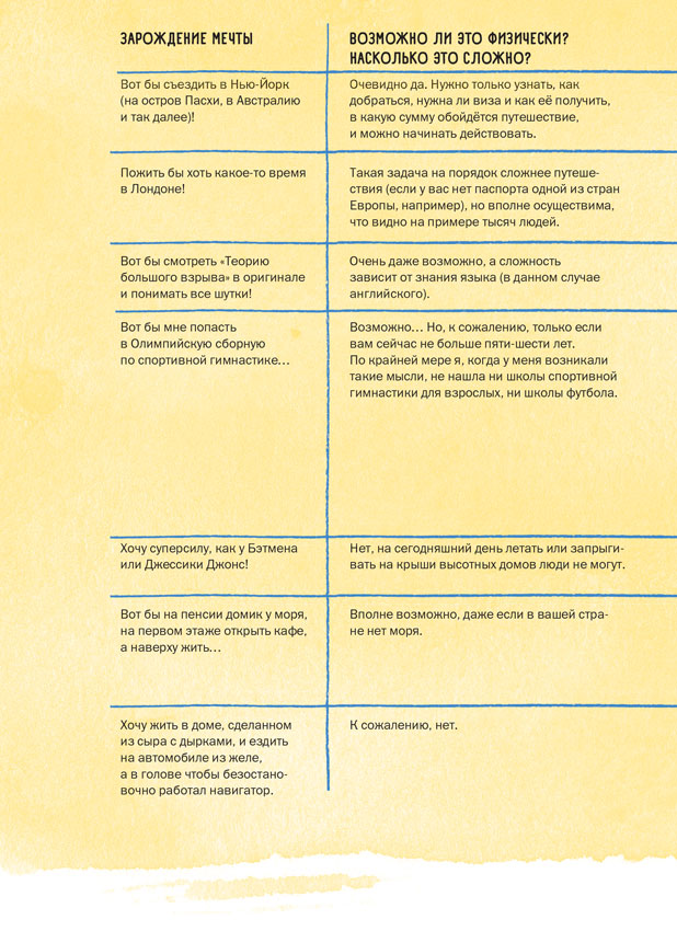 Не все мечты осуществимы. Наверное, странно читать этот тезис в книге, призванной научить исполнять мечты, но лучше быть объективными. Не зря я пишу выше, что мечта обычно не сразу предстаёт во всём своём масштабе, она зарождается постепенно и на этом этапе важно отфильтровать возможное от невозможного. Критерий прост: если другие люди смогли, то и я смогу.