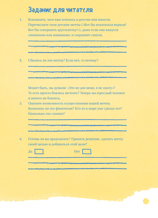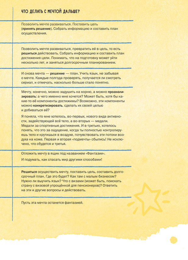Если явных физических препятствий нет, можно превращать мечту в цель, начинать собирать информацию и составлять план. Иногда полезно отпустить мечту в свободное плавание и понаблюдать: как часто вы возвращаетесь к ней, видоизменяется ли она?