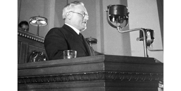 «от Щецина на Балтике до Триеста на Адриатике над европейским континентом опустился железный занавес». Он также подчеркнул: «Коммунистические партии, которые были весьма малочисленны во всех этих государствах Восточной Европы, достигли исключительной силы, намного превосходящей их численность, и всюду стремятся установить тоталитарный контроль».
