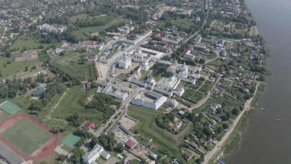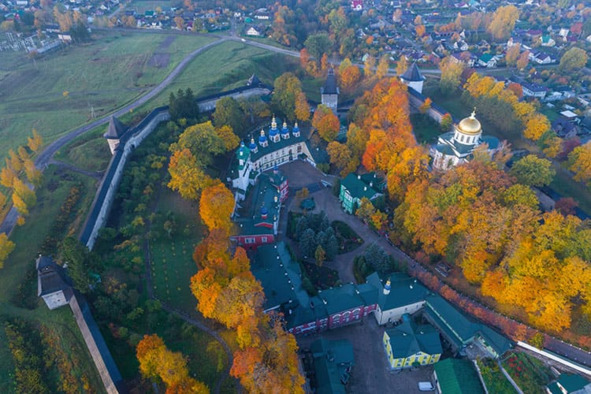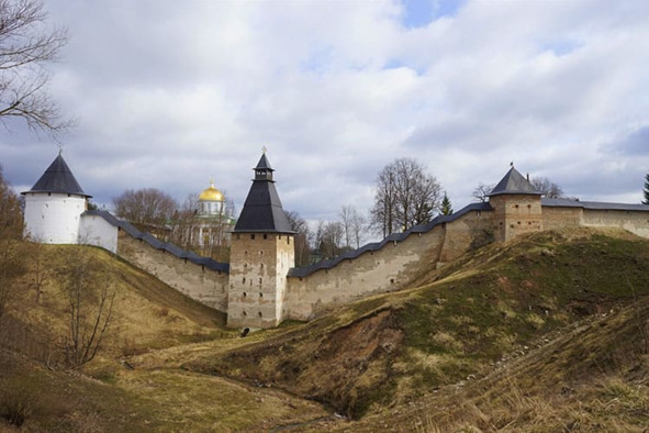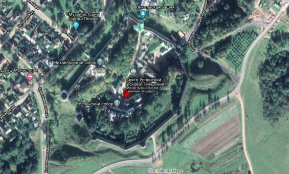 – Часть крепостей расположены крайне неудачно с точки зрения рельефа местности – например, в низинах, что косвенным образом указывает на то, что место постройки выбиралось по другим критериям. Например, ниже – фото Псково-Печерского монастыря, демонстрирующие, что он также является крепостью-звездой и что одна из его башен расположена в овраге;
