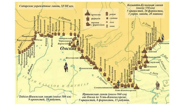 Отдельного упоминания заслуживают укреплённые линии обороны Сибири (Тоболо-Ишимская, Иртышская, Колывано-Кузнецкая), построенные вроде как в XVIII веке по указу Петра для защиты от неких кочевников. Надо сказать, что это одна из самых грандиозных и протяжённых оборонительных линий мира (порядка 200 км!), а вот о серьёзных столкновениях Российской Империи с джунгарами или кем-то ещё в этом регионе в это время нам особо неизвестно…
