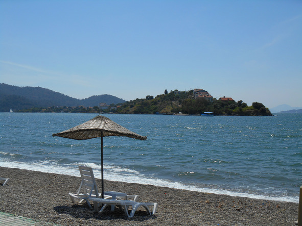 Этот остров отлично виден с набережной в центре города. Но, пожалуй, самое симпатичное место, чтобы рассматривать его – ресторан Beach club на мысу пляжа в Чалыше, от которого остров отделен лишь узким проливом. Здесь, закинув ногу на ногу, можно часами рассматривать скалистые горбы, черепичные крыши, чешуей сползающие по сосновым склонам, пятачки пляжей, моторки, снующие туда-сюда.