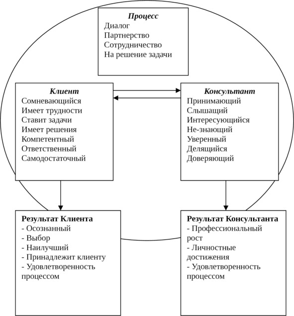 КПП становится возможна, когда процесс беседы «клиент – специалист» осуществляется в форме диалога, где обе стороны рассматриваются как равноценные партнеры. Только тогда они могут быть в отношениях сотрудничества, направленного на решение задачи, стоящей перед клиентом.