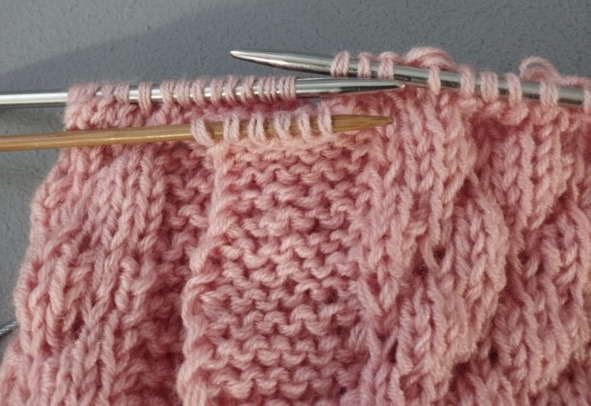 В конце 95 ряда нужно 6 последних петель переснять на запасную спицу, положить верхнюю планку на нижнюю и затем 6 раз провязать вместе по две петли лицевыми (одну петлю берем с верхней планки с запасной спицы, а вторую с нижней планки). На двух планках из 12 петель должно остаться шесть. Всего на спицах 96 петель должно получиться. Замыкаем вязание в круг и далее будем вязать по кругу.