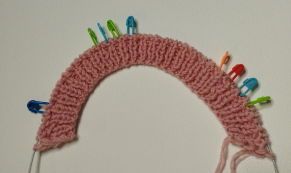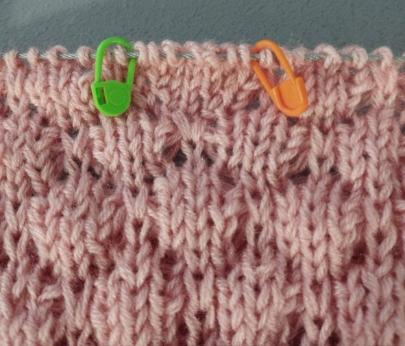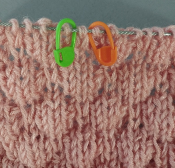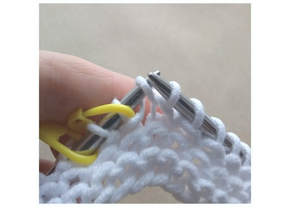 Затем будем вязать ластовицу. Для этого по центру переда и спинки нужно повесить маркеры (одна петля между маркерами).