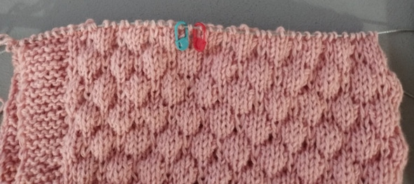 97 ряд (после синего маркера): 47 лицевых, прибавка из протяжки, 1 лицевая, прибавка из протяжки, 47 лицевых, прибавка из протяжки, 1 лицевая, прибавка из протяжки