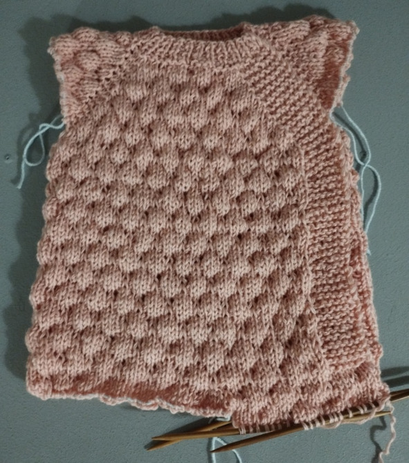 25 ряд: кромочная, 6 лицевых, 2 лицевых реглана, прибавка из протяжки, 21 лицевая, прибавка из протяжки, 2 лицевых реглана, прибавка из протяжки, 35 лицевых, прибавка из протяжки, 2 лицевых реглана, прибавка из протяжки, 21 лицевая, прибавка их протяжки, 2 лицевых реглана, прибавка из протяжки, 31 лицевая, прибавка из протяжки, 3 лицевых, накид, две вместе лицевой, 1 лицевая, 1 изнаночная