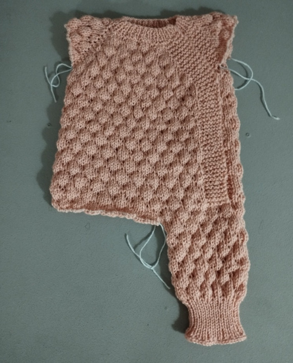 21 ряд: кромочная, 5 лицевых, 2 лицевых реглана, прибавка из протяжки, 17 лицевых, прибавка из протяжки, 2 лицевых реглана, прибавка из протяжки, 31 лицевая, прибавка из протяжки, 2 лицевых реглана, прибавка из протяжки, 17 лицевых, прибавка их протяжки, 2 лицевых реглана, прибавка из протяжки, 27 лицевых, прибавка из протяжки, 6 лицевых, 1 изнаночная