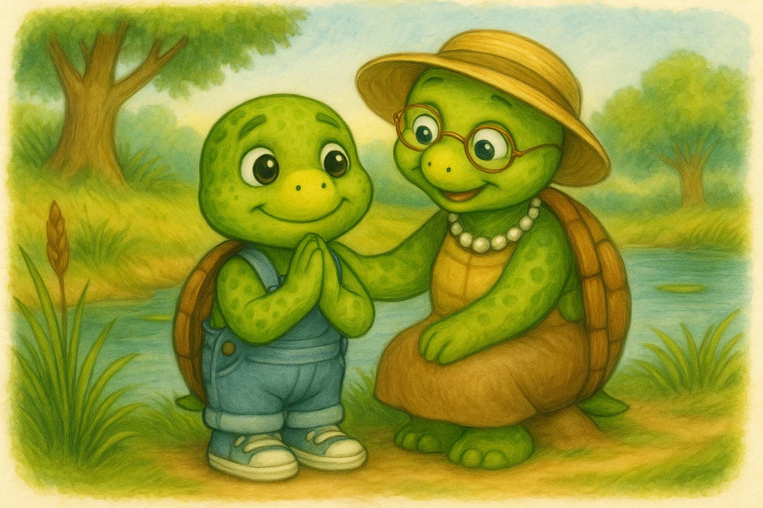 – Но, малыш, черепашки не спешат. Мы любим спокойные дни и долгие посиделки у пруда.