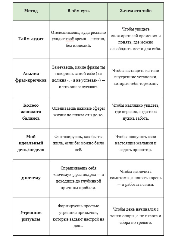 Сейчас я покажу тебе простые, но рабочие инструменты, которые помогут выстраивать планы с опорой на себя. А потом – практика. Чтобы ты не просто читала, а примерила всё на себя и почувствовала: «О, так можно!»
