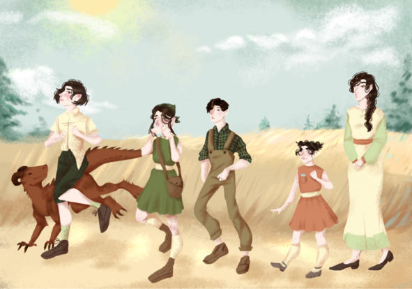 Теперь шли молча: каждый переводил дух от такого энергичного утра. Фэйт и Эрли приотстали. Дракон, виновато опустив морду, плёлся рядом, чешуйчатый золотистый хвост поднимал дорожную пыль. Уна на ходу пыталась заглянуть в рот Брай: язык пока не появился.