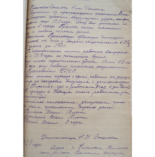 Как-то случайно я проверяла сайты учреждений образования Саратовской области и обнаружила историческую справку о Николевской школе, в которой рассказывалось о том, что «до 1 сентября 1931 года в с. Николевка Балаковского района Саратовской области действовала начальная школа. Учителями 1—4 классов работали: Козлов Василий Григорьевич, Руина Анастасия Романовна, Павельева – Соколова Нина Ивановна, Соколов Василий Иванович». В 1931—32 гг. Павельева Н. И. (супруга Соколова) продолжала ещё работу в этой школе. На руках у неё оставались несовершеннолетние дети. Благодаря краеведу Саратовской области Ю. Ю. Каргину нашёлся документ в отделе образования Балаковского района, написанный рукой супруги Соколова. Подобные бумаги заставляли заполнить только с той целью, чтобы выявить, насколько члены семьи разделяют взгляды подозреваемого.