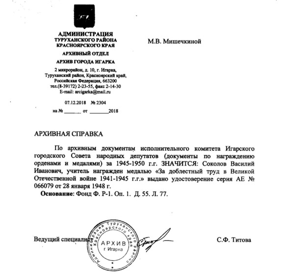 Через год Указом Верховного Совета СССР от 12.02.1949 г. учителю начальных классов семилетней школы №1 г. Игарки Василию Ивановичу Соколову была вручена медаль «За трудовое отличие», при этом отмечалась выслуга лет и безупречная работа (фонд Ф. Р-1, Оп. 1, Д. 55. Л. 47). Василий Иванович уехал из Игарки в 1952 году. Но уехал не к себе на родину, а в город Горький. Узнала я об этом совершенно случайно. Познакомилась в 2018 г. с журналистом В. Г. Григорьевым, который жил и работал в Игарке до 1978 г. По его словам, в учительском доме по улице Кирова, 22 на втором этаже находилась квартира В. И. Соколова. Володя Григорьев был тогда ещё маловат, чтобы помнить все подробности проживания Соколова в этом доме, но серьёзность соседа, густоватый голос и усы запомнил. Другая подробность этого очевидца ещё более поразила.