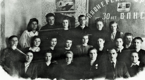 Коллектив педагогов. Справа второй в нижнем ряду – В. И. Соколов. 1951 г. Из архива автора