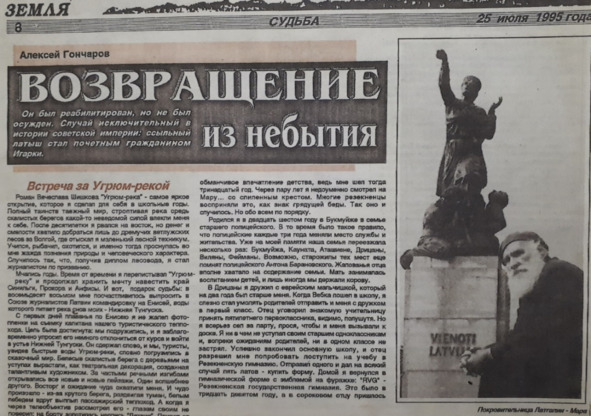 Несколько лет назад у меня появилась возможность познакомиться с журналистом Владимиром Григорьевичем Григорьевым. Мы работали на Игарской студии телевидения, но в разное время. Встретились не просто как коллеги. Владимир Григорьевич, как и его друзья Леопольд Антонович и Георгий Петрович, всегда испытывал особый интерес к истории Игарки, где он родился. Он фиксировал события как журналист, но с дотошностью неравнодушного исследователя собирал и хранил представляющие историческую ценность документы. Мы много говорили и спорили об Астафьеве, о редких событиях и значимых фигурах, повлиявших на развитие Игарки. Оказалось, что Леопольд Антонович – наш общий добрый друг. Архив В. Г. Григорьева очень помог при подборе иллюстраций.