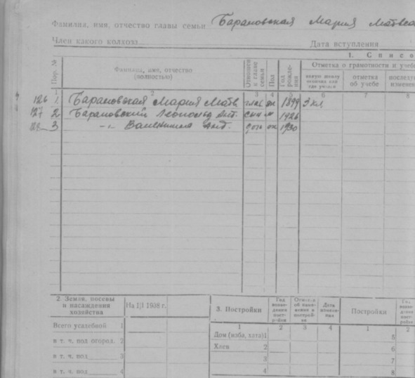 Попался и такой документ – «Похозяйственная книга» артели «Красный Октябрь» Плахинского сельского совета за 1943 год». В ней под номерами 126, 127 и 128 занесены фамилии: Барановская Мария Матвеевна, 1898 года рождения (записана как глава семейства), Барановский Леопольд Антонович (сын, 1926 года рождения), Барановская Валентина Антоновна (дочь, 1930 года рождения).