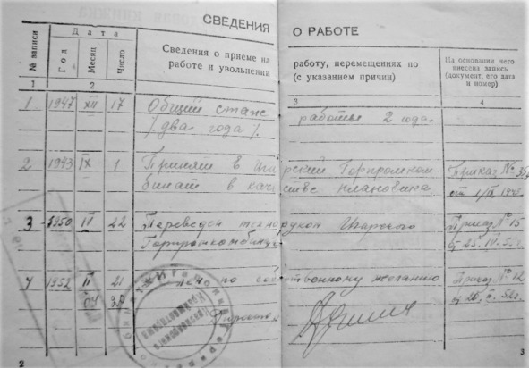 Оказывается, первая запись в трудовой книжке в Игарке была сделана в 1947 году, но отмечено, что с 1 сентября 1943 г. Леопольд «принят в Игарский Горпромкомбинат в качестве плановика».