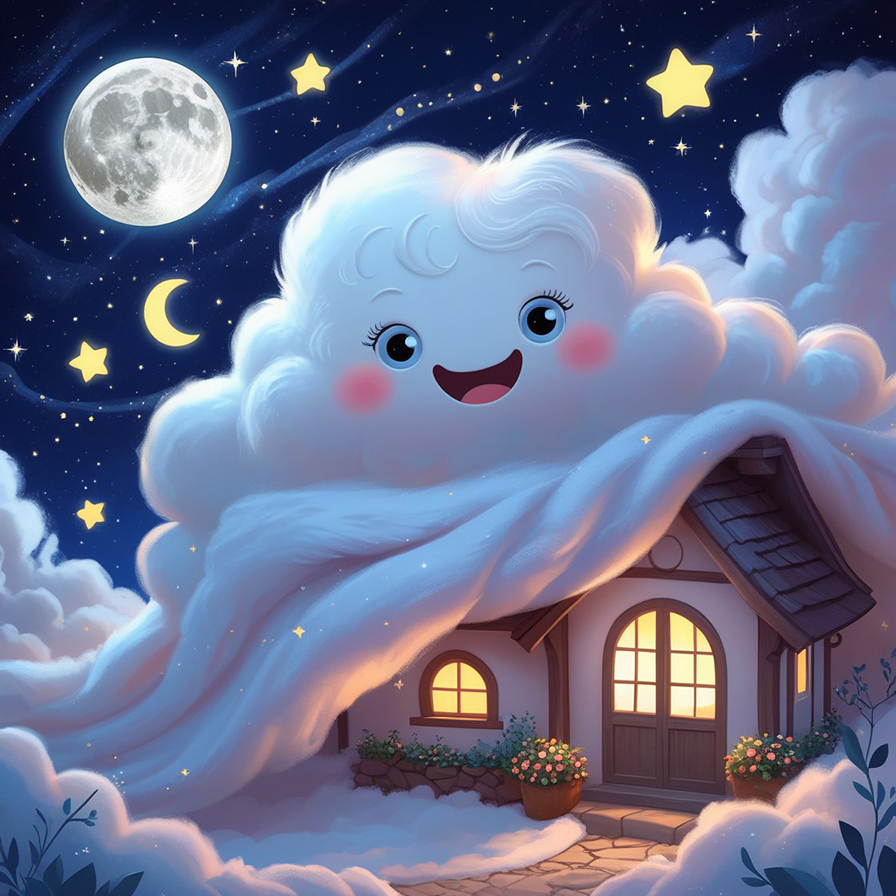 Пушинка обрадовалось! Оно растянулось над крышей и превратилось в легкую дымку. А чтобы сны были сладкими, облачко шептало:
