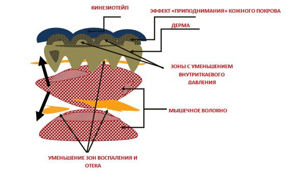 Кроме того, через аппликацию кинезиотейпа реализуется механизм создания благоприятных условий для саногенетических процессов за счет нормализации микроциркуляции в соединительной ткани, коже и подкожной клетчатке.