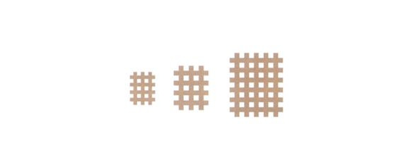Кросс-тейпы имеют ряд отличий от оригинальных кинезитейпов. Кросс-тейпы изготовлены из поливинилхлорида, имея тонковолокнистую структуру и обычно выпускаются в размерах трех вариантов: тип А 3 линии х 4 линии, 3 мм. в ширину; тип В 3 линии х 4 линии, 4 мм. в ширину; тип С 5 линий х 6 линий, 4 мм. в ширину (рис. 14). Размер кросс-тейпа подбирают в зависимости от области, на которую их наклеивают. Кросс-тейп, в отличие от кинезиотейпа, можно носить, не снимая довольно длительное время до 3-х недель.