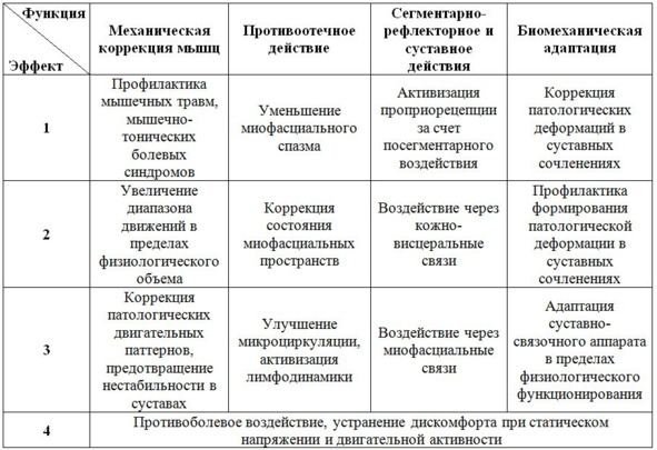 Таблица 2. Основные функции и терапевтические мишени кинезиотейпирования