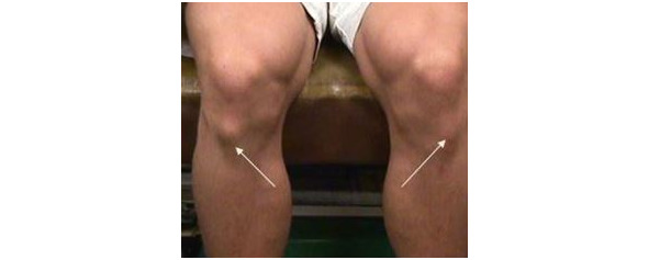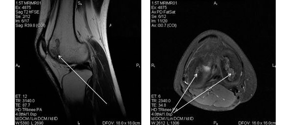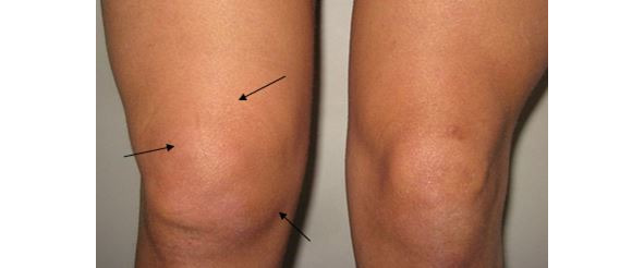 Рисунок 24. Синовиит правого коленного сустава при болезни Кенига с преимущественной зоной выпота в надколенниковой сумке (верхнем завороте надколенного сустава)