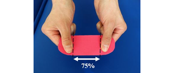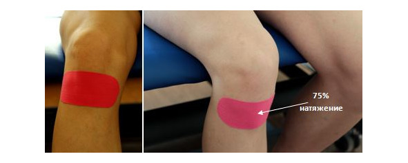 Далее мы просим пациента согнуть коленный сустав под углом 90. Используя первую половину кинезиотейпа необходимо надорвать слой вощеной бумаги с обратной стороны тейпа, не прикасаясь к клейкой стороне. Среднюю часть тейпа мы наклеиваем под надколенником (коленной чашечкой) достигая 75%-ного натяжения по диагонали в области болевого ощущения (рис. 18). Боковые концы кинезиотейпа накладываются с нулевым натяжением (рис. 19). о