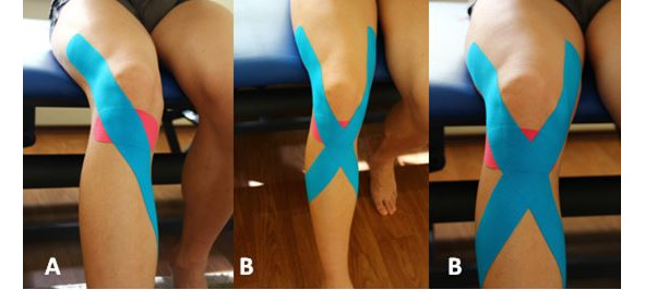 Рисунок 20. A – Кинезиотейпирование коленного сустава 2-й этап, B – Кинезиотейпирование коленного сустава 3-й этап и вид законченной аппликации