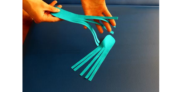 Кинезиологическое тейпирование при данной патологии обладает рядом положительных эффектов – уменьшает нагрузку на сухожилие четырехглавой мышцы бедра, снижает давление на бугор большеберцовой кости, снимает отек и воспаление, уменьшает болевые ощущения, при этом сохраняя физиологический объем движений в коленном суставе. Методика тейпироввания при болезни Осгуда-Шлаттера весьма проста и занимает немного времени. Вначале необходимо сложить ленту кинезиотейпа пополам и закруглить специальными ножницами острые углы на сложенной стороне. Закругление угловых концов тейпа производится с целью более плотной фиксации его на кожном покрове, так как остающиеся острые углы могут способствовать его частичному отклеиванию и уменьшать терапевтический эффект.