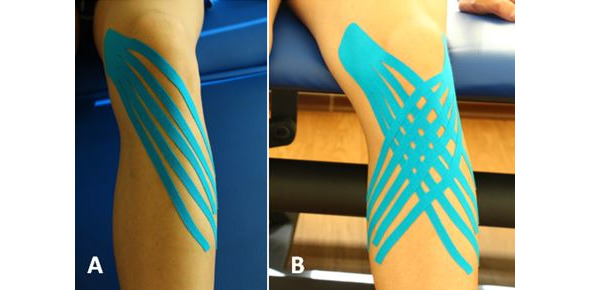 Рисунок 22. A-Противоотечная методика кинезиотейпирования коленного сустава, 1 этап; B-Противоотечная методика кинезиотейпирования коленного сустава, 2 этап