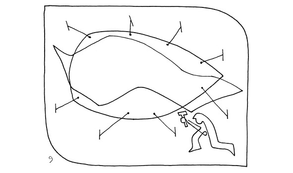 Крошечный крючок, брошенный в рот архетипической рыбы, символизирует неадекватную реакцию человечества на приближающиеся земные перемены. Вместо того, чтобы открыть свое сердце для помощи, которую нам предлагает существо Земли, мы размышляем о возможностях сокращения выброса газов, ускоряющих парниковый эффект. Вместо того, чтобы признать, что мы, как цивилизация, роковым образом отдалились от любящего сознания живой Земли и божественной Вселенной, мы хотим представить свое отчуждение отправной точкой для перспективных решений в виде технических вмешательств, таких как «геоинженерия».