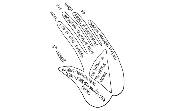 Воздух (мизинец): мысли, образы, чувства. Земля (безымянный палец): воплощенные формы. Огонь (средний палец): вдохновение и процесс творения. Вода (указательный палец): поток жизненных сил. Пятый элемент (большой палец): существа, переводящие матрицы в проявленные формы. Ладонь: матрица Земного Космоса.