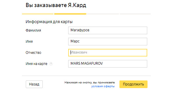 Заполняем информацию о карте: ФИО, имя на карте. Не забываем прочитать статью «Условия оферты» и переходим к четвертому шагу.