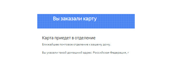 Процесс заказа карты завершен. Она изготавливается не более 3 рабочих дней и отправляется по почте заказным письмом, которое придет в ближайшее почтовое отделение примерно через неделю (можете следить, где находится карта, по трек-номеру; его вам сообщат в письме на e-mail).