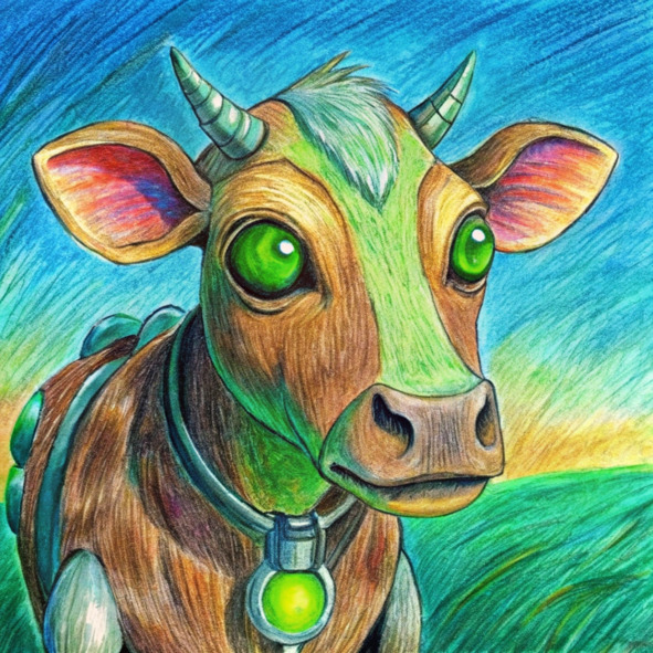 – Машина была увенчана блестящей серебристой головкой, ее рожки были закручены в две элегантные антенны. Большие, мягкие на вид карие глаза, совсем как у настоящей коровы, смотрели с ее морды. Под головой располагался гладкий металлический корпус, из-под которого выглядывали механические внутренности с прикрепленными к основанию колесиками.