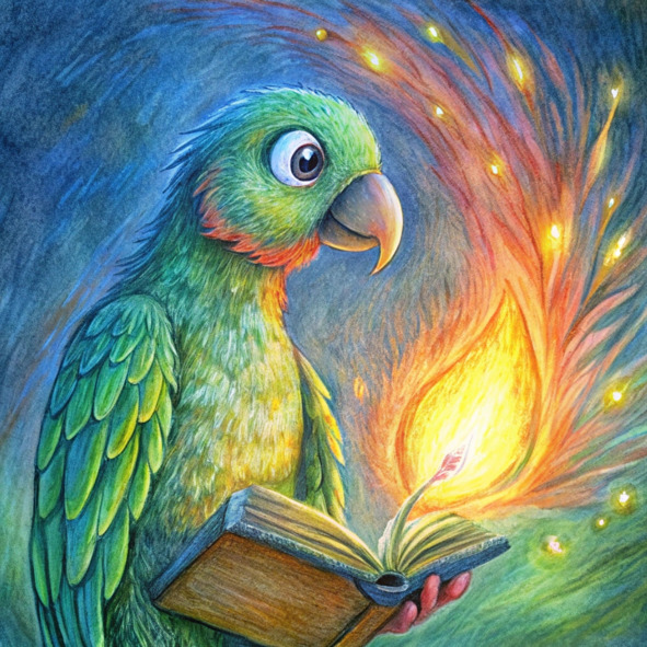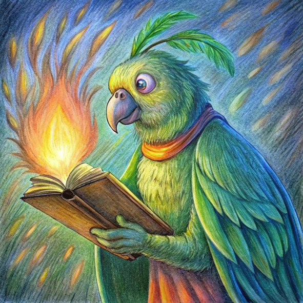 Низкий свист эхом разнесся по пещере, и Элиана подпрыгнула. Ее глаза расширились от удивления. На насесте над входом сидел старый мудрый попугай с изумрудными перьями, устремив на нее свои ярко-красные глаза. Он снова пискнул, затем протянул книгу в кожаном переплете, страницы которой шептали забытые секреты. Элиана ахнула, когда попугай осторожно положил книгу ей на колени.