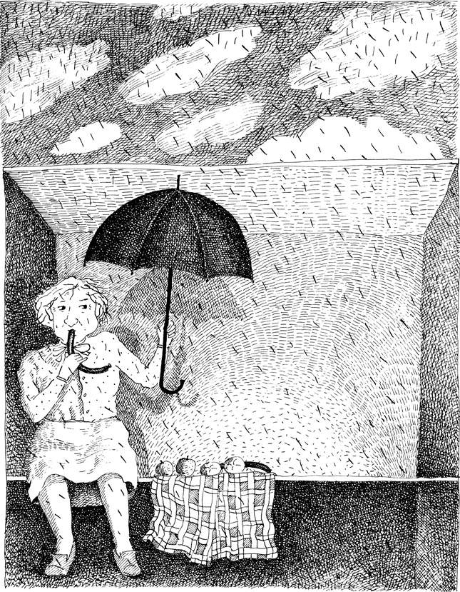 Удивлённый Фридер бросается к окну… Бабушка сидит напротив дома, на другой стороне улицы. Под навесом на остановке трамвая! В руке у неё зонтик, а рядом на скамейке она расстелила кухонное полотенце – вместо скатерти. На нём лежат яблоки. И булочки. И сосиски. Бабушка машет Фридеру, прикладывает руки ко рту и кричит: