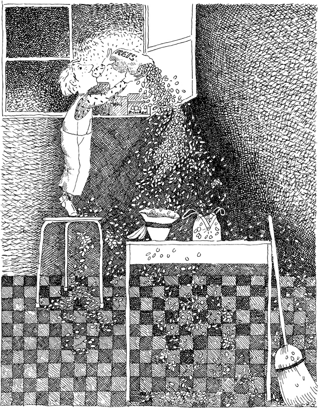 Значит, надо что-нибудь приготовить. Лучше всего – рисовую кашу. Фридер её очень любит. Для рисовой каши нужны рис, и молоко, и корица, и сахар. Это Фридер давно уже знает. Рис стоит в кухонном шкафу. Фридер приносит табуретку, залезает на неё, открывает дверцу шкафа – и так сильно дёргает за пакет с рисом, что тот рвётся, и рис сыплется на пол. Но это пустяки. Можно ведь всё подмести.