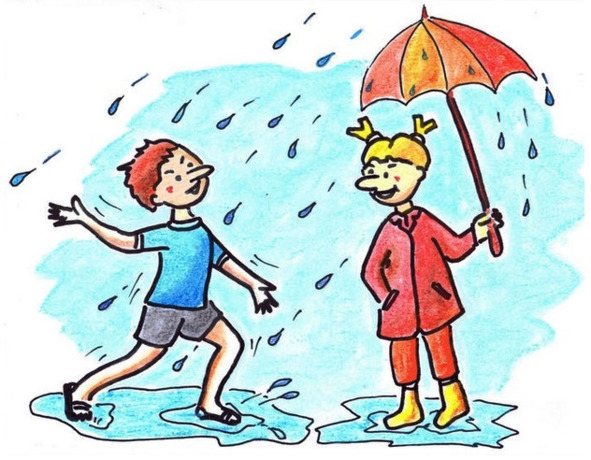 Лето в этом году прохладное, температура ниже десяти градусов, ветер, дождик моросит. Мама и Катя одеты по погоде, с зонтиками.
