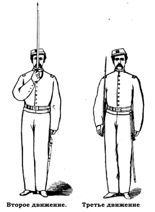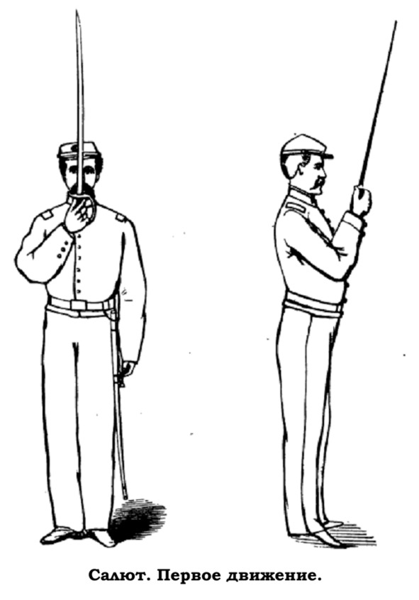 Штаб-сержанты (за исключением инспекции) держат свои сабли в ножнах и приветствуют осматривающего в порядке, предписанном на стр. 15 «Тактики» Аптона. При смотре они обнажают свои сабли и, подойдя к осматривающему, переводят их в положение «закрыться», держа руку у подбородка, клинок почти перпендикулярно, острие вверх.