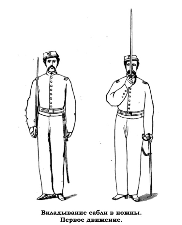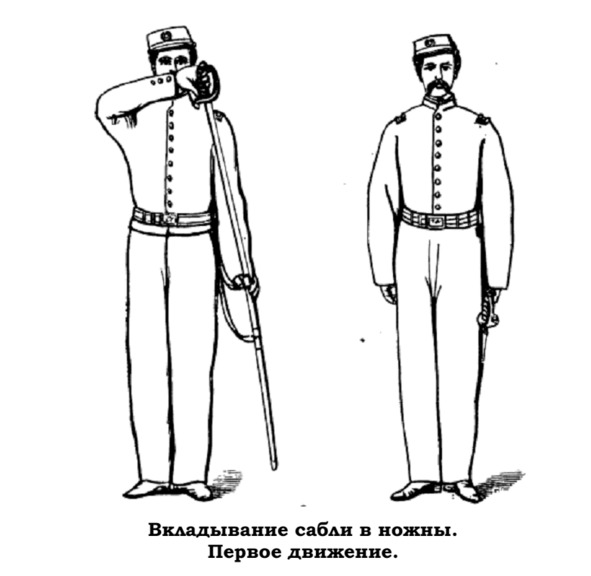 Легким мускульным усилием пальцев вставить саблю в ножны по рукоять, не опуская руки ниже левого соска, после чего отпустить ножны и встать в положение «смирно».