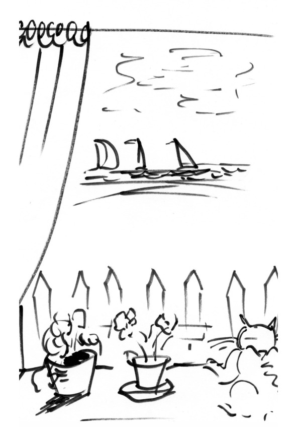 Стоя у окна я смотрел, как вдали, на горизонте, белые запятые яхтенных парусов обгоняли друг друга, а над ними клубились облака. Прошел один большой пароход, за ним поменьше. Быстро промелькнула «Ракета». Она летела прямо и красиво.
