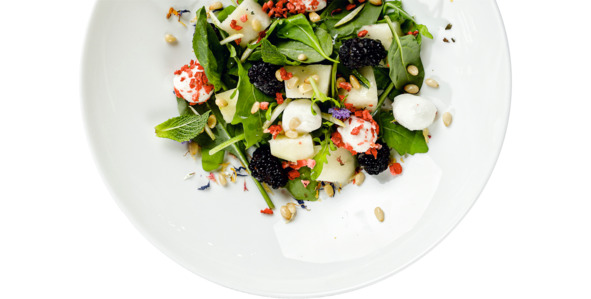 Салат из зелени с грушей и ежевикой