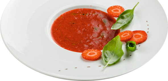 На помидорах делаем крестообразный надрез, заливаем кипятком и даем постоять 1—2 минуты. Затем заливаем холодной водой и снимаем кожицу. Удаляем плодоножку и семена, нам понадобятся плотные сочные стенки помидора. У огурцов удаляем кожуру и семена. У земляники убираем плодоножки. Подготовленные овощи и землянику пробиваем погружным блендером до однородной консистенции, солим, перчим по вкусу. Добавляем базилик, уксус бальзамический и еще раз хорошо перемешиваем. При подаче декорируем нарезанными кружками свежей клубникой и листочками базилика.